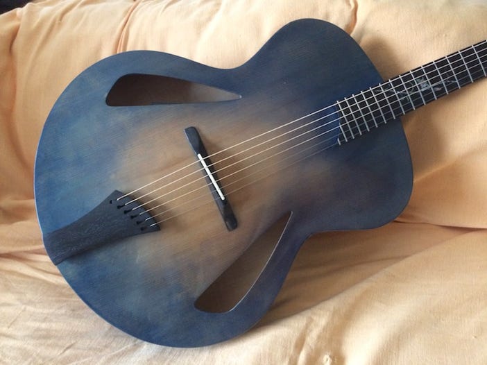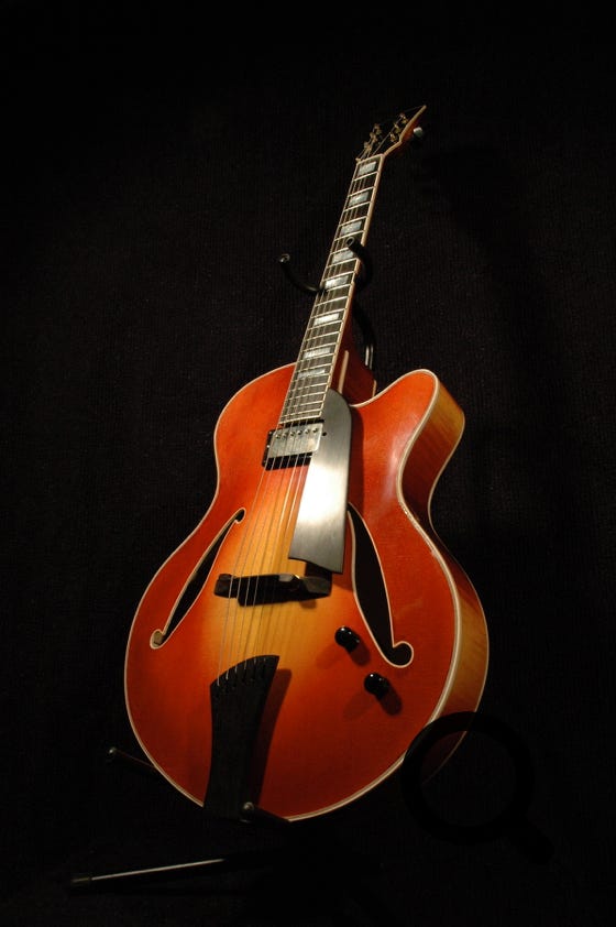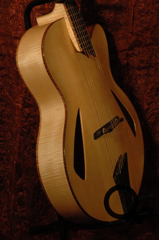 Jade is a simplified version of the Ruby model, less ornate, but made with the same care and attention as its fancier sister. I use slightly less figured woods for the body, and Jade has less elaborate bindings all around. Tonally, the guitar is the same as Ruby, only the exterior is less fancy. To make it your own personalised instrument, a lot of options are available of course, just as on Ruby. As standard, Jade also comes with a floating pickup and controls mounted on the pickguard, but a top mounted pickup is of course possible. Pictured is an example of a Jade model with some custom options (Sunburst finish, top mounted pickup, bound f-foles, neck and headstock)