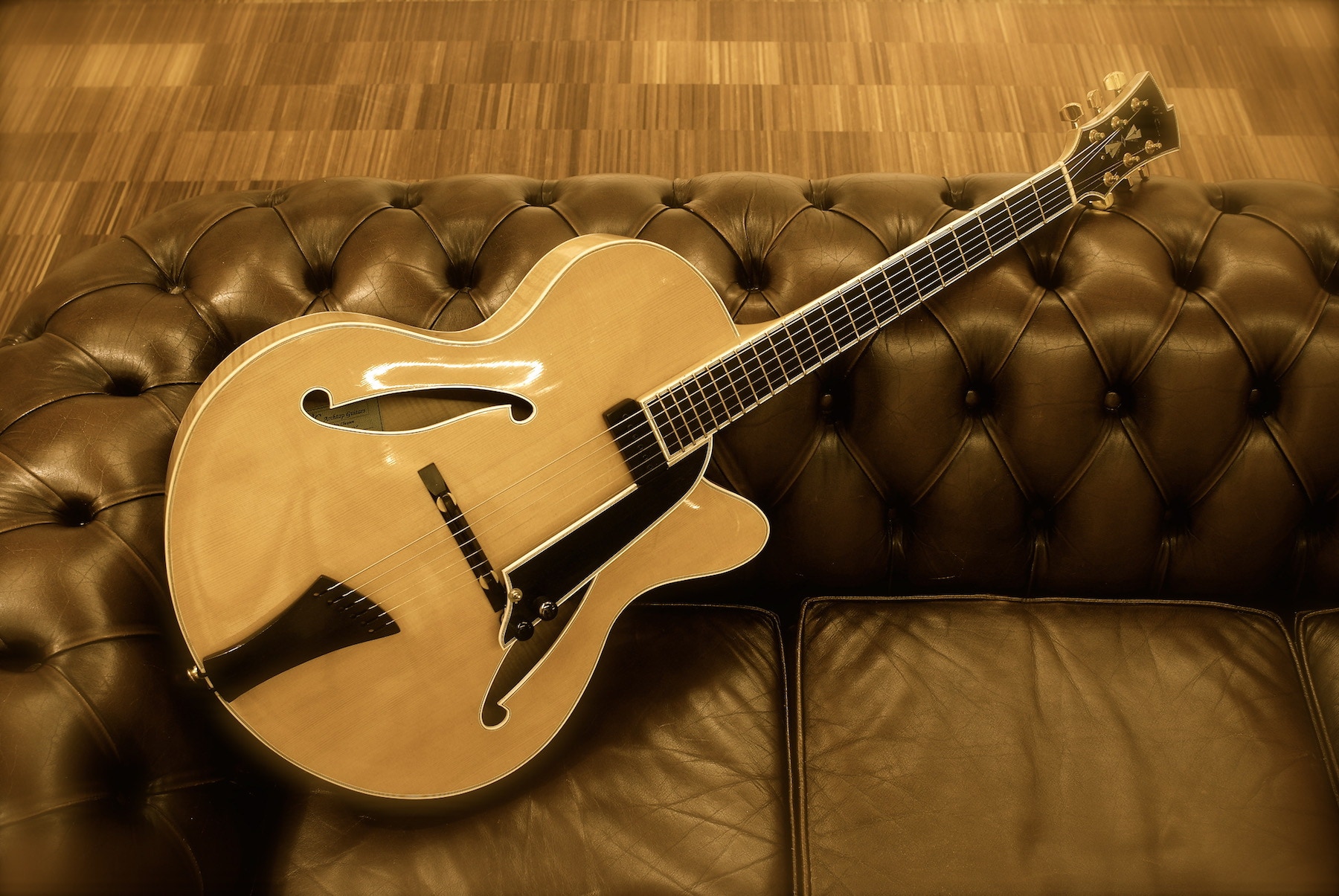 With Sapphire, I wanted to take the archtop in a different direction, and try to move away from the traditional punchy, percussive and ‘harsher’ sound, with a different bracing style and larger soundholes. The end result is a cross between the archtop sound when played hard and the warmer tones of a flattop acoustic with a softer playing style, or even fingerstyle. The standard version of Sapphire is made with high grade and beautifully figured woods, but very sparse appointments, no body, fingerboard or headstock binding, to let the beauty of the woods shine. Options like wood bindings, inlays or various colour finishes are of course possible, as is the choice of a pickup system suited to your playing style.